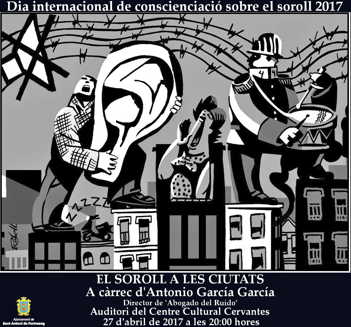 Este acto, organizado por el Excelentísimo Ayuntamiento de Sant Antoni de Portmany, tendrá lugar a las 20:00 horas en el Auditori del Centre Cultural Cervantes de dicho municipio. Con el título «El ruido en la ciudad, esta conferencia tratará los agentes generadores de ruido urbano así como la normativa, procedimientos y acciones frente al mismo así como la necesidad de emprender acciones de concienciación frente a este grave problema.